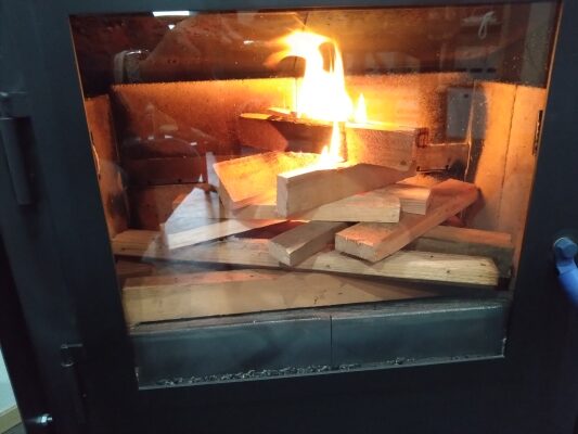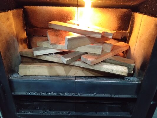 私は、いつもの燃焼実験のため、細薪を井形に2段組み+一番上に細木を1段組みして給気口は全開にして準備が整い、早速着火(上段着火)して扉を閉めて火が大きくなるのを待っていましたが、全然大きくならず、約3分後に消えてしまったのです。