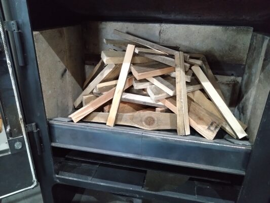 お客様がご使用したい薪は、滋賀県伊吹山山系のアカマツでそれらを持ち込んでもらい、弊社店舗内の薪ストーブ(すみれ)を使用して、①薪の重量、②燃焼残留物の重量、③燃焼残留物の採取を実施し、①と②は秤量計で計測しました。
