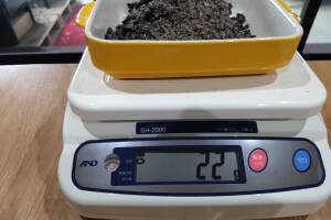 灰トレイ上に集めた燃焼後残留物 計量(22g)
