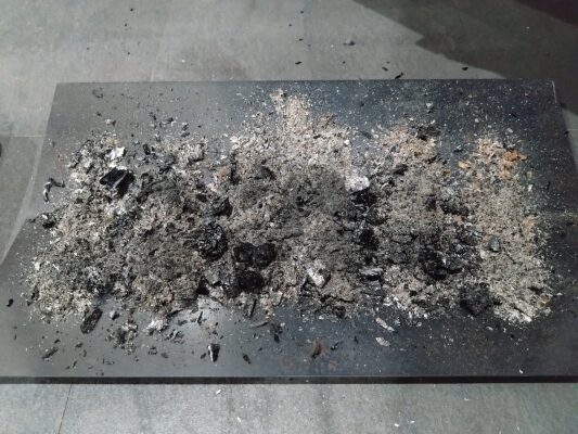 残留物の重量値の結果は、少し意外でした。もう少し重量があるものと考えていましたが、重量比が1/10まで縮小していました。アカマツは針葉樹で完全燃焼しやすい樹種であることがわかりました。